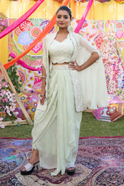 Pista Color Organza Crepe Zardosi Work Dhoti Style Indo Western Skirt