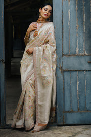 Striking Beige Color Organza Weaving Work Designer Festive Wear Saree With Fancy Blouse
