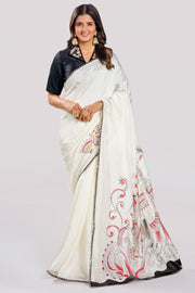 Pure Dola Silk Hand Print Pallu Saree With Stand Neck Collar Blouse